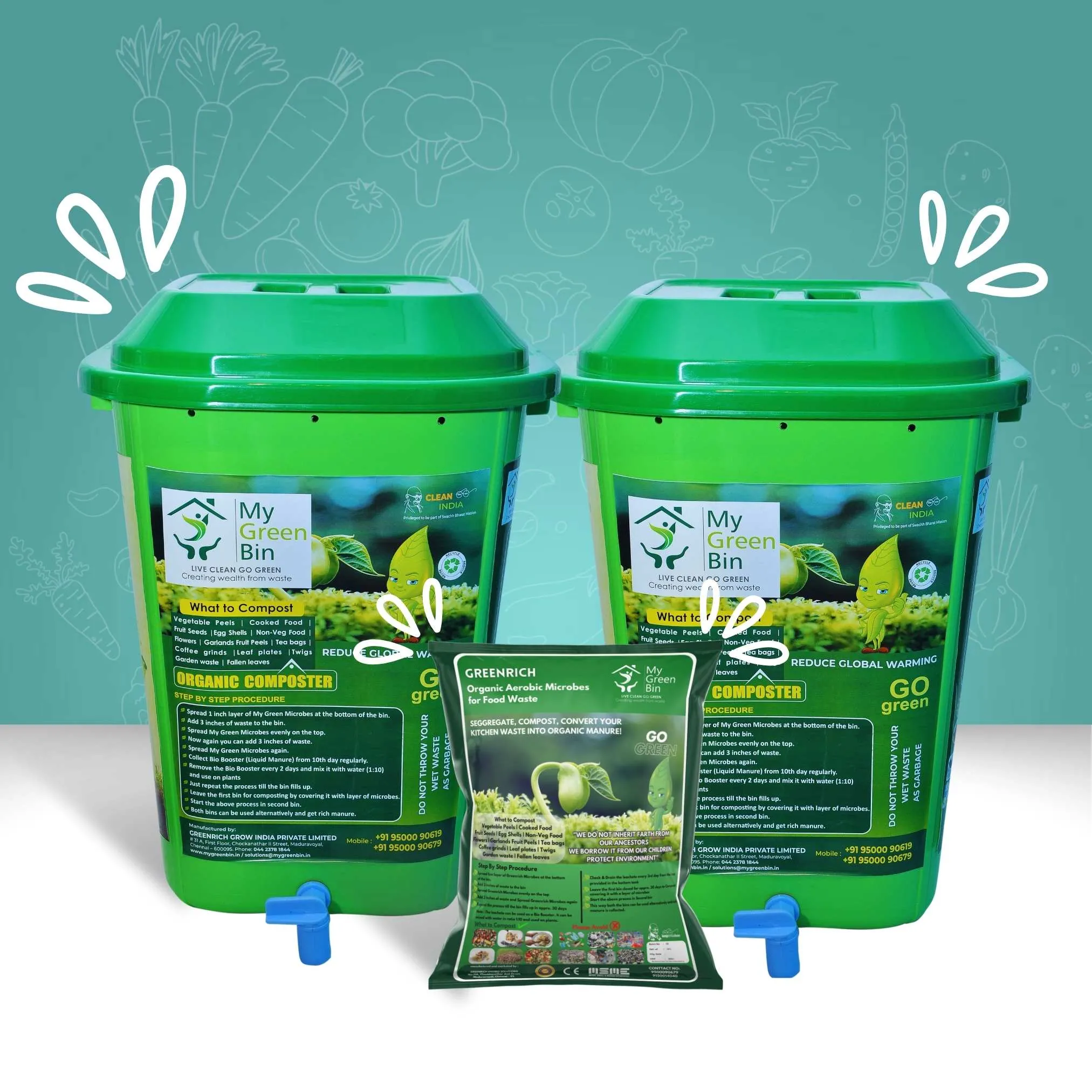 With a 50-liter capacity per bin, it fits easily in kitchens, balconies, or patios without taking up too much space. The included 10 liters of high-quality composting microbes accelerate the breakdown of food waste, ensuring odor-free, fast, and efficient composting. These microbes naturally digest organic matter like fruit and vegetable peels, coffee grounds, and garden clippings—producing rich, healthy compost in just a few weeks.
