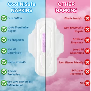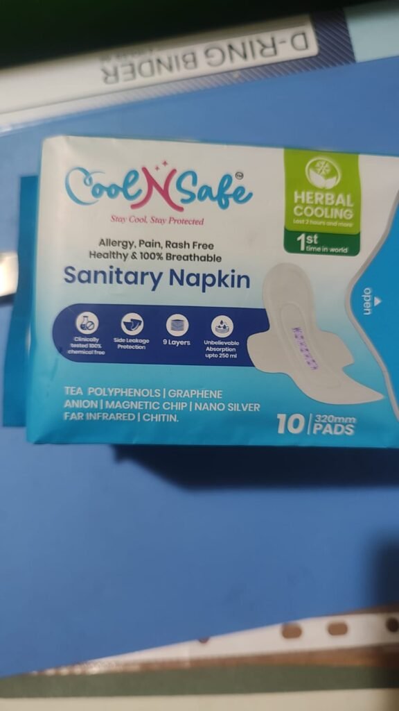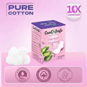 Designed for long hours and sensitive skin, Cool N Safe combines advanced technology with everyday comfort. Its 10-in-1 medicated health strip works continuously to reduce discomfort, fight bacteria, control odor, and keep you cool, while the breathable cotton surface and high-absorption core ensure dryness and leak protection.