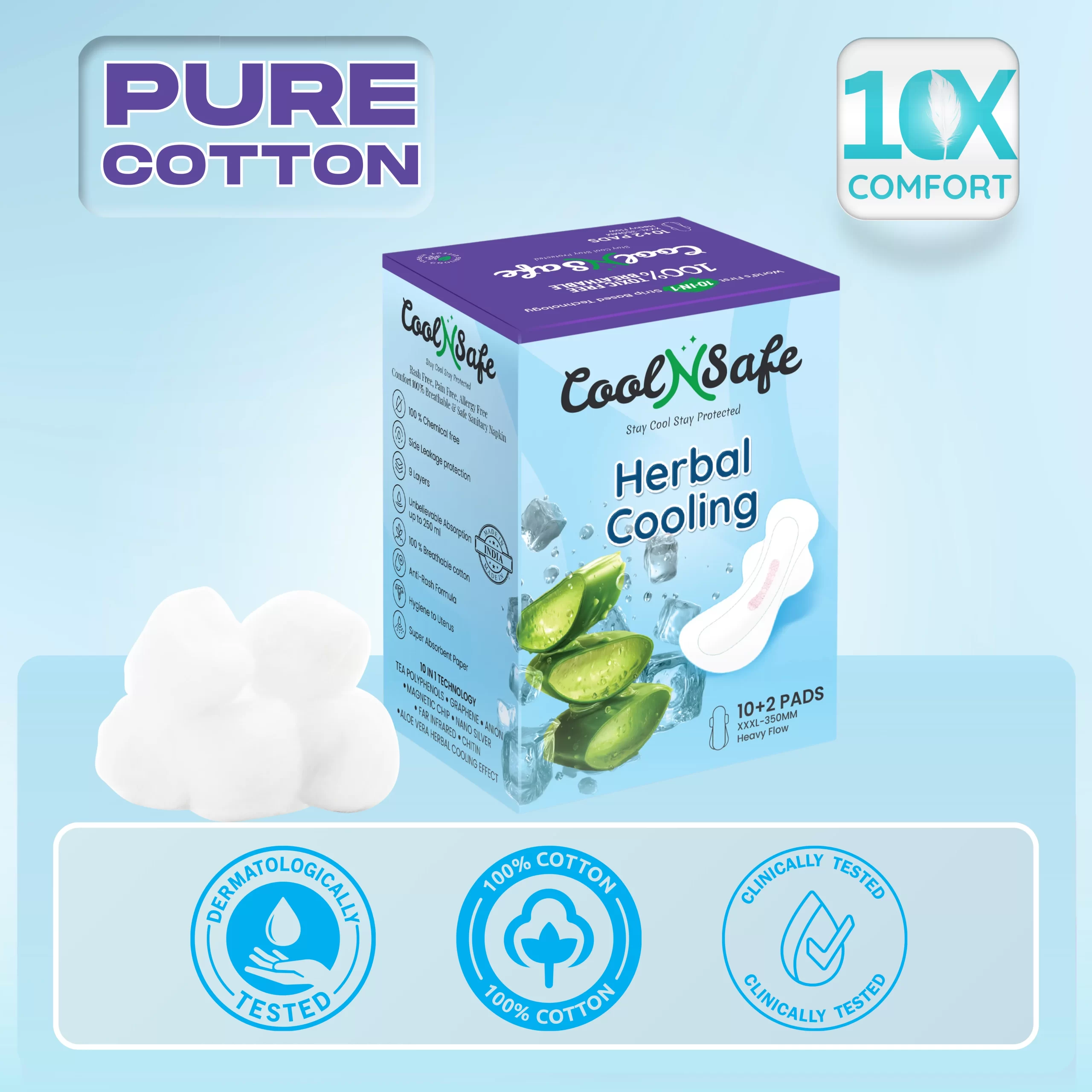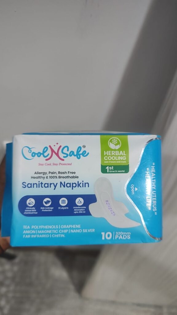Designed for long hours and sensitive skin, Cool N Safe combines advanced technology with everyday comfort. Its 10-in-1 medicated health strip works continuously to reduce discomfort, fight bacteria, control odor, and keep you cool, while the breathable cotton surface and high-absorption core ensure dryness and leak protection.