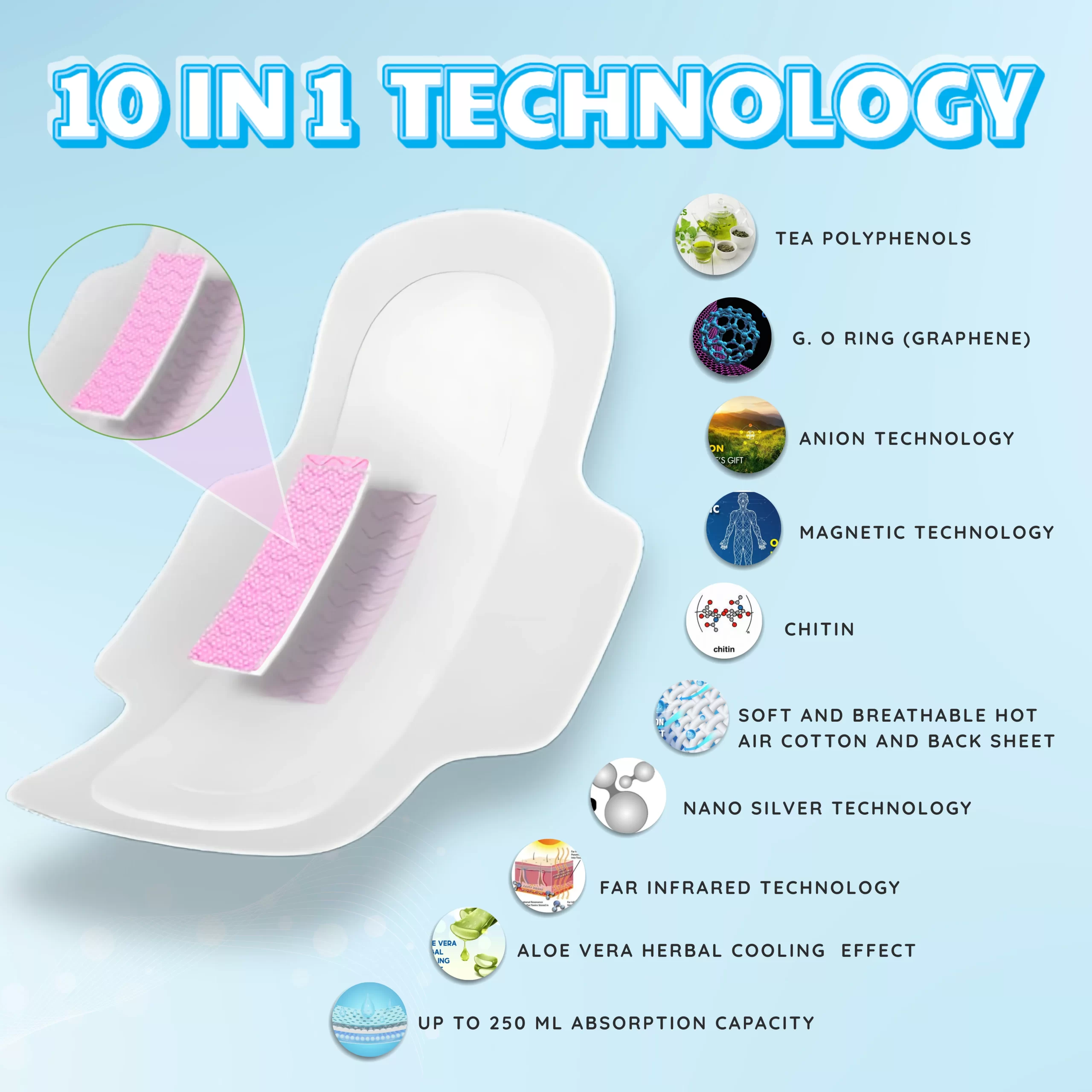 A medicated health strip embedded with advanced technologies such as Anion, Graphene (G.O Ring), Nano Silver, Magnetic therapy, Far-Infrared rays, Tea Polyphenols, and Chitin—working together to support comfort and hygiene.