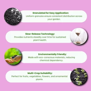 The fertilizer is suitable for a variety of crops, including vegetables, fruits, flowers, cereals, and ornamental plants. It also supports a neutral soil pH, which is beneficial for long-term soil health and optimal nutrient uptake.